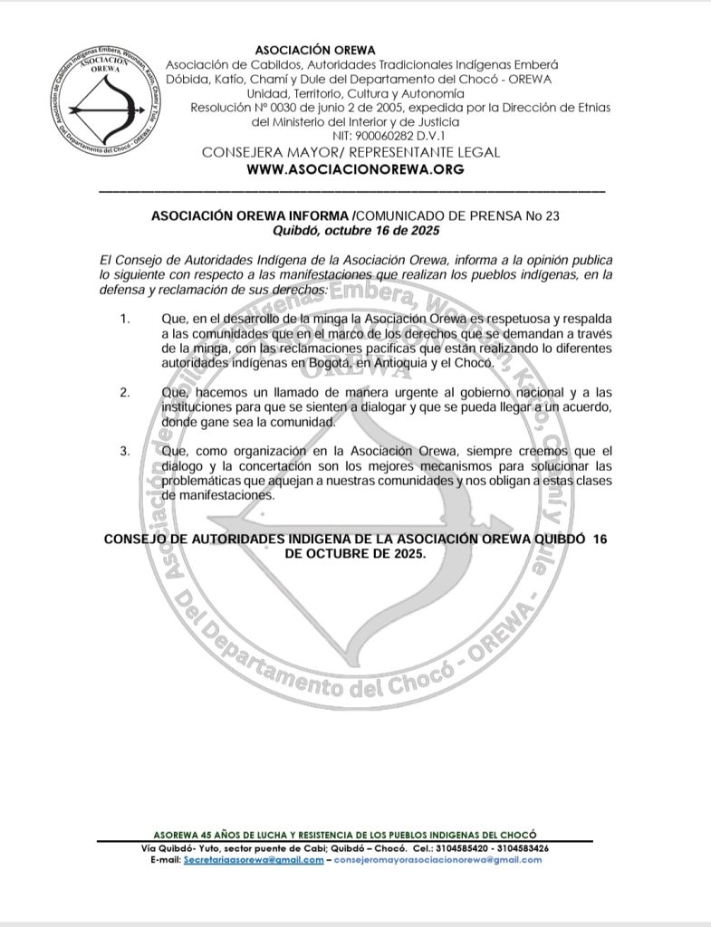 El Consejo de Autoridades Indígena de la Asociación Orewa, informa a la opinión publica lo siguiente con respecto a las manifestaciones que realizan los pueblos indígenas, en la defensa y reclamación de sus derechos: